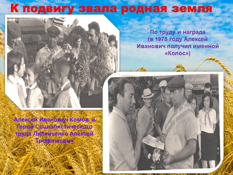 Закончив уборку в своём колхозе, Комов, следуя завету: «Земля соседа – не чужая земля», поехал помогать труженикам совхоза«Красноармейский». Вместе поехали в колхоз «40 лет Октября» Цимлянского района,звено Алексея Ивановича оказывало помощь в уборке рабочим совхоза «Майорский», а затем они переезжают на уборку в Чертковский район. Заканчивали сезон на уборке риса в соседнем Пролетарском районе Алексей Иванович говорил: «Цель ведь у нас была общая: выполнить первую хлеборобскую заповедь. Тут уж не разбираешь – своё поле, чужое ли. Ведь хлеба чужого не бывает, он весь – свой, наш, общий». Со знанием этого жил в жаркую пору уборки каждый. Отсюда и подлинный трудовой героизм, и не единичный, а массовый. За уборку в том году Комов Алексей Иванович получил от Таганрогских рабочих именной «Колос».