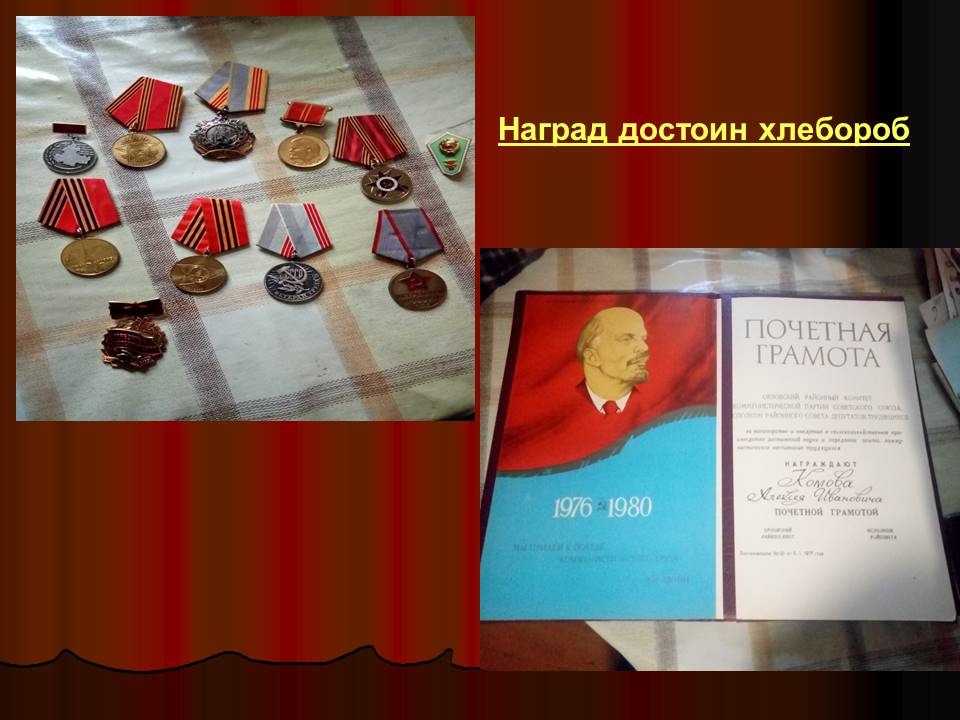 Звено перевыполнило задание по вспашке почвы в полтора раза. Включаясь в социалистическое соревнование за получение трёхсот тысяч тонн орловского хлеба, Герой Социалистического Труда ЛилейченкоАлексей Трофимович заявил: «Я приложу все силы, старание и умение, чтобы повторить трудовой подвиг прошлого года – намолотить30 тысяч центнеров зерна». По 20 тысяч центнеров дали слово намолотить члены звенаАлексей Иванович Комови Илья Александрович Дорохов. Всего звеном решили намолотить 70 тысяч центнеров зерна.Не привыкли бросать слова на ветер трудяги. Сдержали слово.Конечно, такой труд не мог остаться незамеченным. Указом Президиума Верховного Совета СССР от 7 декабря 1974 года Комов Алексей Иванович был награждён Орденом Трудового Красного Знамени. Затем будут и другие награды: медаль за трудовую доблесть, многочисленные грамоты и похвальные листы.